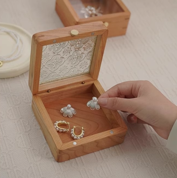 Scatola di immagazzinaggio di gioielli in legno di ciliegio; Piccola scatola di accessori per coperchio in vetro; Collana e bracciale squisita medaglia.