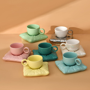 Vendita calda coppia creativa regali Macaron cuscino a forma di tazza in ceramica porcellana latte tè tazze da caffè e piattino Set